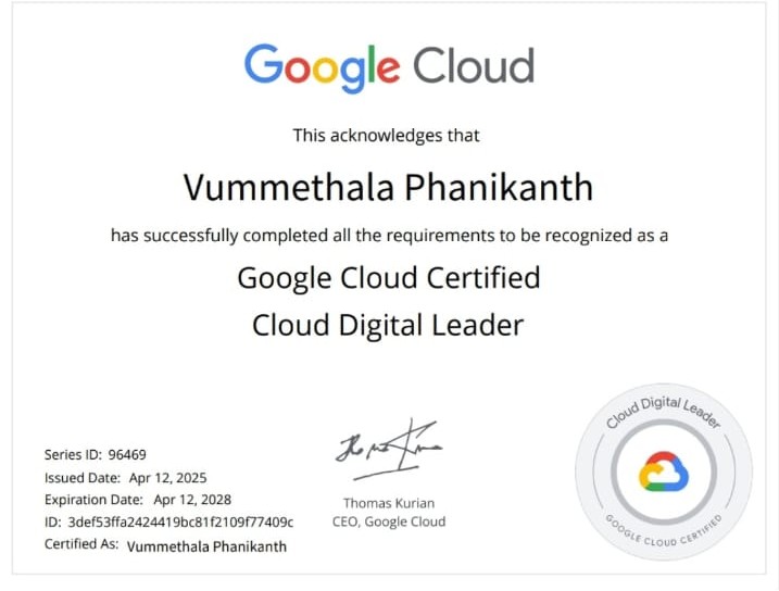 Phanikanth holds an MBA in Marketing from Dravidian University and is a Salesforce Certified Administrator as well as a Google Cloud Certified Digital Leader, underscoring his commitment to continuous learning and digital innovation.